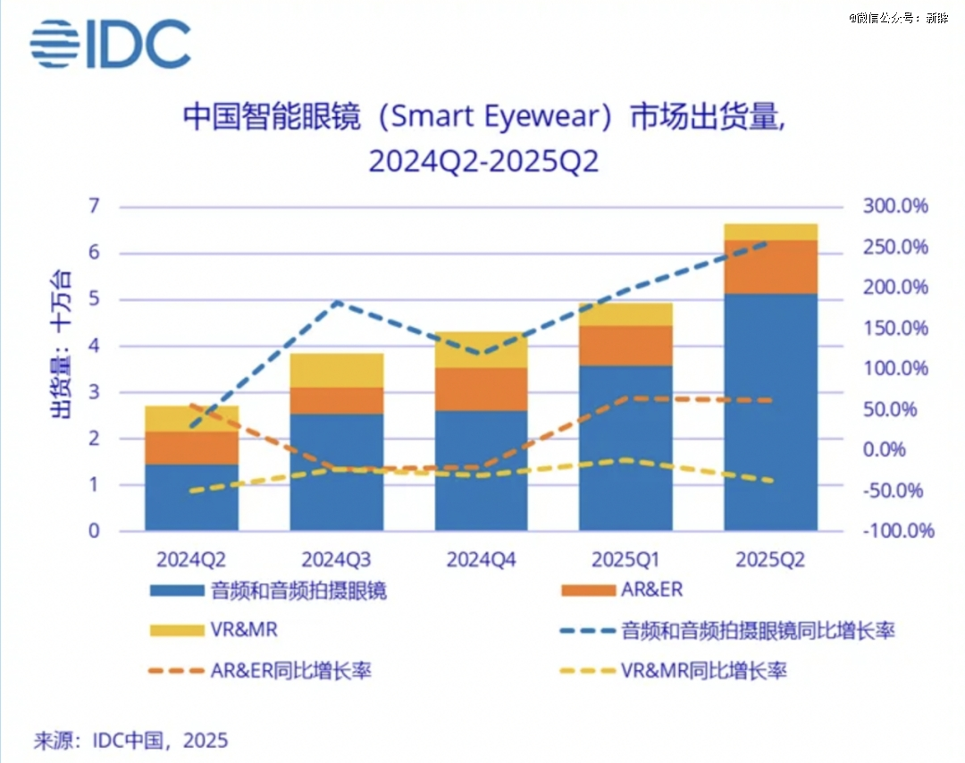 IDC数据显示,2025年第二季度全球智能眼镜市场出货量达255.5万台,同比增长54.9%;中国市场的表现更为抢眼,出货量达66.4万台,同比增长145.5%。各大厂商纷纷布局,从小米到阿里,从Rokid到雷鸟,几乎所有的相关企业都在今年发布了智能眼镜计划。
