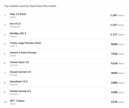3月2日至8日,阶跃星辰Step模型和稀宇科技MiniMax模型占据榜单前三甲。