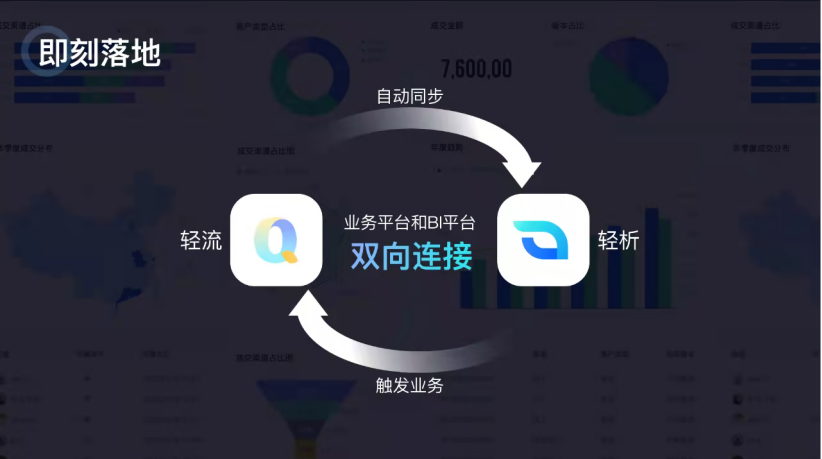 在今年7月6日轻流无代码探索者大会上,轻流原生BI系统——“轻析”重磅发布。首先“轻析”和轻流可以高度协同,它提供了从应用搭建到数据分析的全链路自定义功能,无需再进行额外的开发工作,轻流的数据均可自动同步至“轻析”进行数据分析工作,大大降低了企业引入BI工具的初期成本。通过“轻析”所产生的数据分析结果,触发业务规则,从而影响轻流上的业务系统。