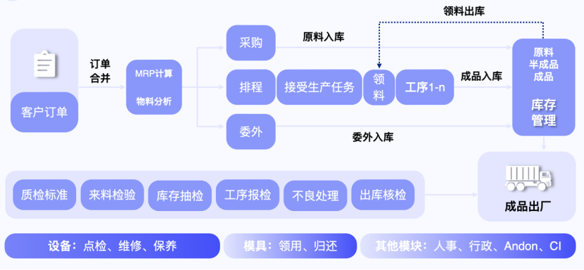 “轻智造”基于轻流aPaaS能力,解决制造企业业务管理难题。它构建了销售中心、采购中心、库存中心、生产中心、质量中心、模具中心、设备中心、精益中心、产品中心、财务中心十大中心模块,全方位覆盖制造业企业的核心业务、辅助业务以及日常业务流程。