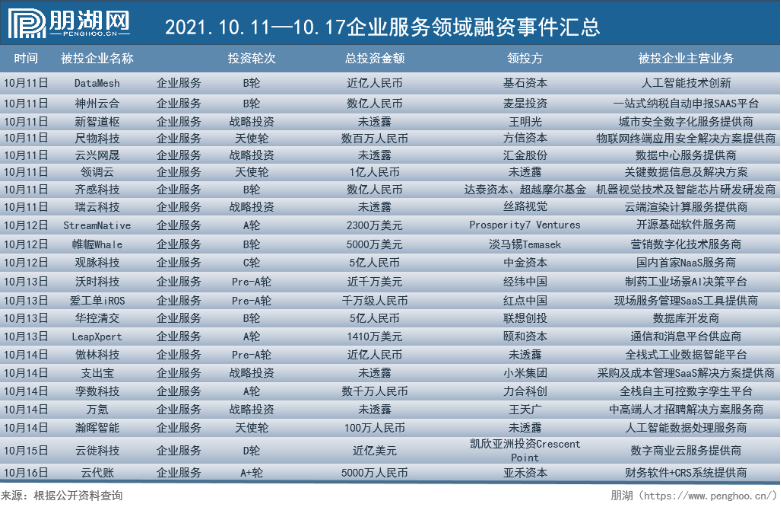 朋湖网围绕企业服务领域,从技术与应用两大服务方向出发,对大数据、云计算、底层技术解决方案服务、企业客户关系管理服务等企服细分赛道进行长期跟踪与观察,为各位每周带来投融资汇总及行业重大事件资讯。以下是2021年10月11日-10月17日的行业动态整理。